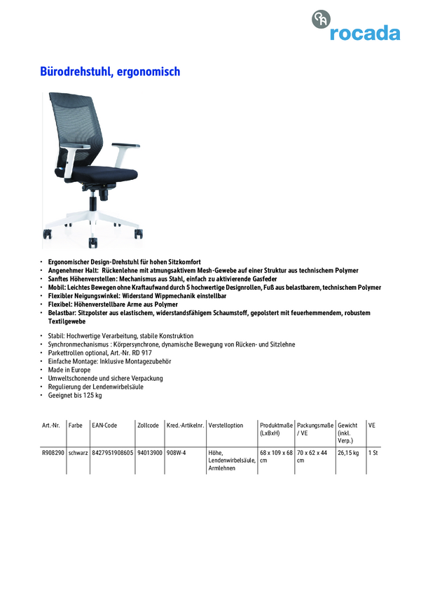Rocada Krzesło biurowe 908W-4 czarny R908290 1 szt.