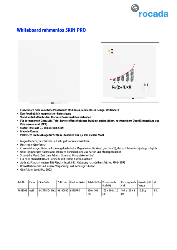 Tablica suchościeralna Rocada 6525PRO (S x W) 100 cm x 100 cm