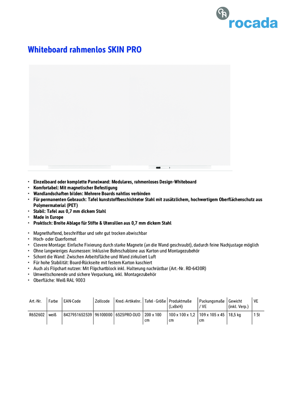 Tablica suchościeralna Rocada 6525PRO-DUO (S x W) 200 cm x 100 cm