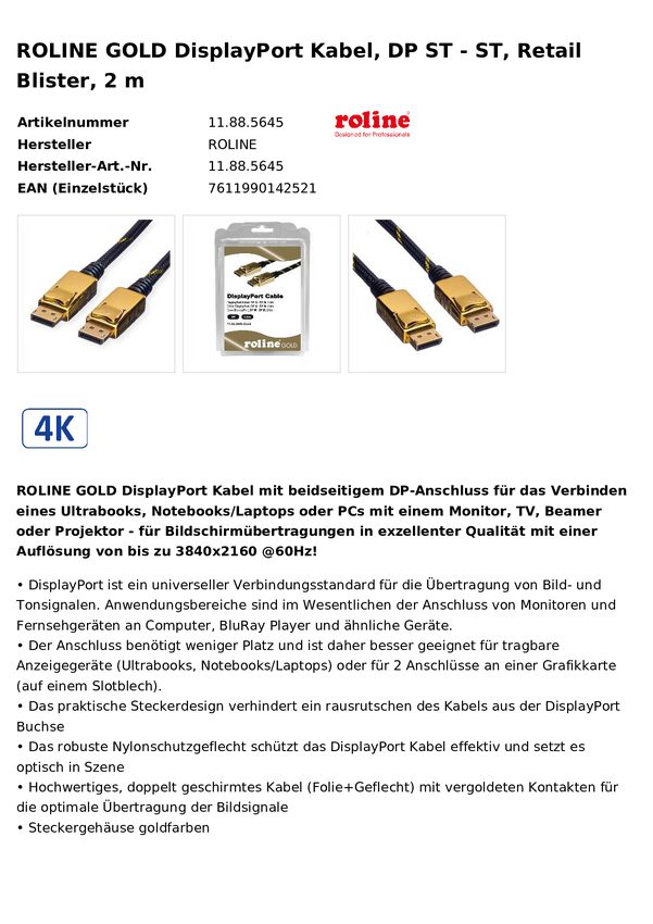 Kabel DisplayPort Roline 11.88.5645, DisplayPort na DisplayPort, 2.00 m