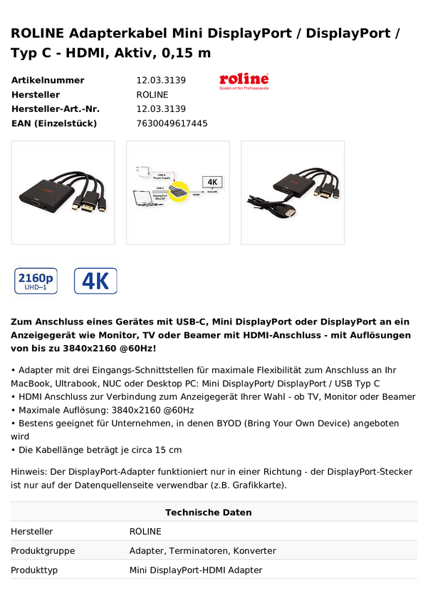 Roline Mini DisplayPort / HDMI adapter Złącze Mini DisplayPort, Gniazdo HDMI-A 0.15 m czarny 12.03.3139 Kabel DisplayPor