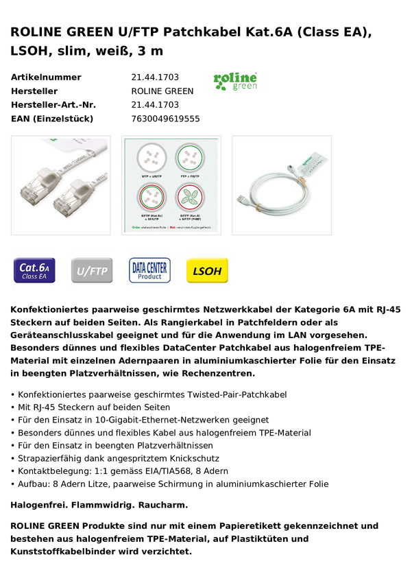 Kabel krosowy ROLINE GREEN U/FTP kat.6A (klasa EA), LSOH, slim, biały, 3m