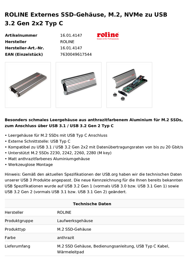 Zewnętrzna obudowa SSD ROLINE M.2 NVMe na USB 3.2 Gen 2x2 Type-C