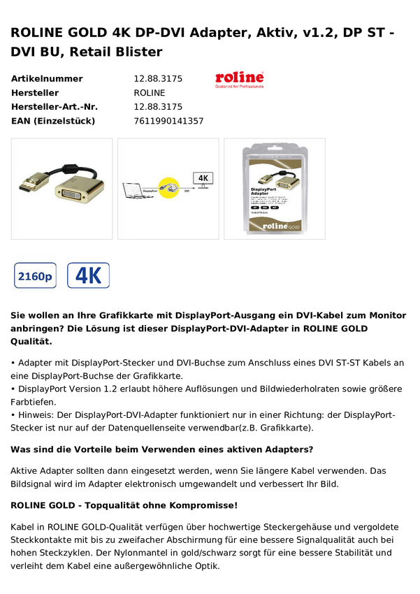 Roline DisplayPort / DVI adapter Złącze DisplayPort, DVI-D 24+1pin. Gniazdo 0.15 m wielobarwny 12.88.3175 Kabel DisplayP