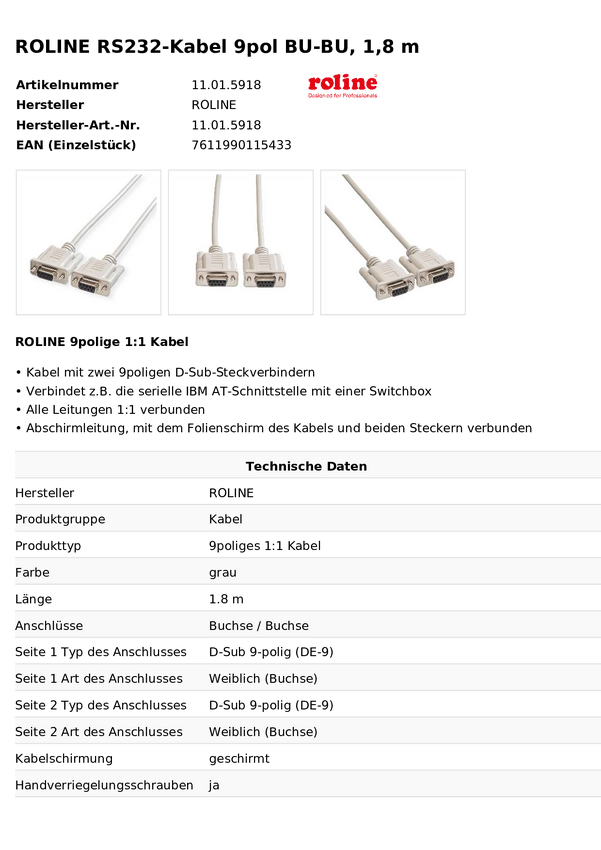 Kabel ROLINE RS232 9-pin BU-BU, 1,8 m