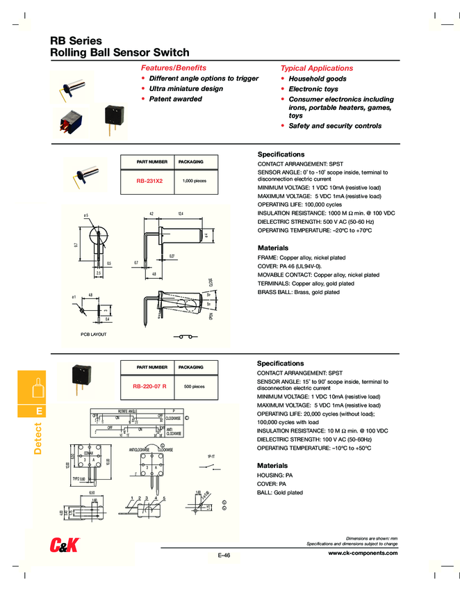 Rolling Ball Sensor SPDT 24VDC Polybutylene Terephthalate 4-Pin