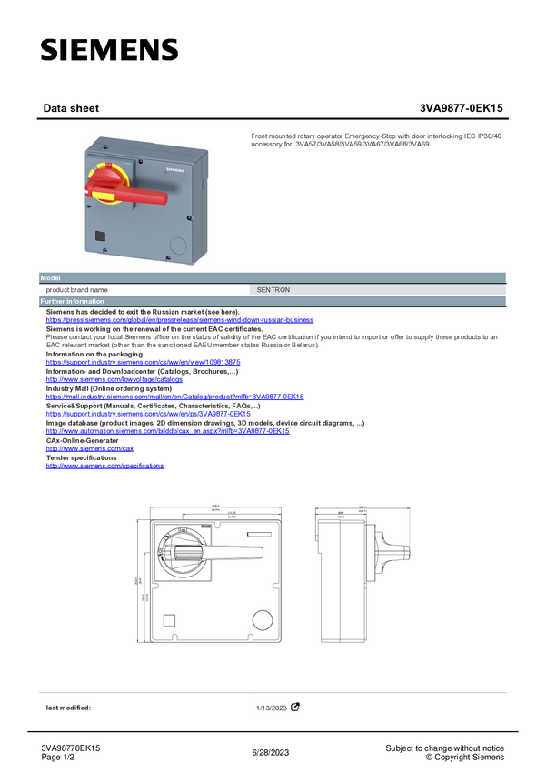 Przedni napęd rotacyjny Siemens 3VA9877-0EK15 1 szt.