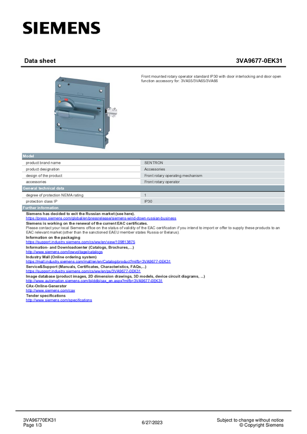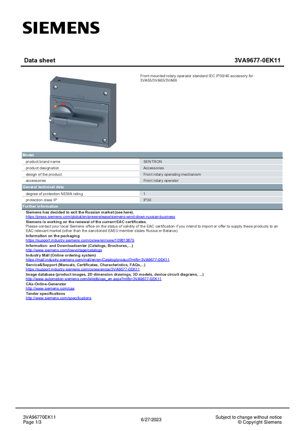 Przedni napęd rotacyjny Siemens 3VA9677-0EK11 1 szt.