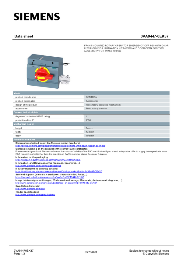 Przedni napęd rotacyjny Siemens 3VA9447-0EK37 1 szt.