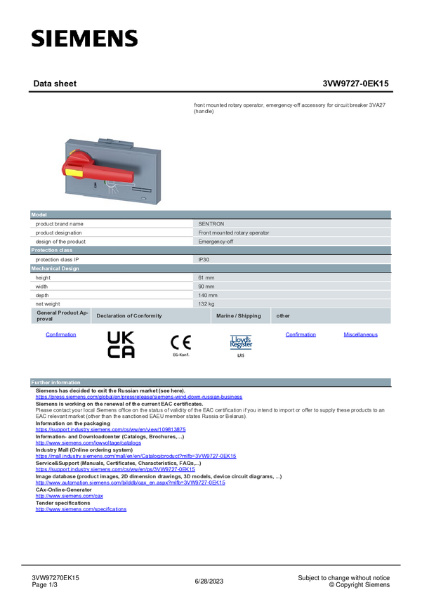 Przedni napęd rotacyjny Siemens 3VW9727-0EK15 1 szt.