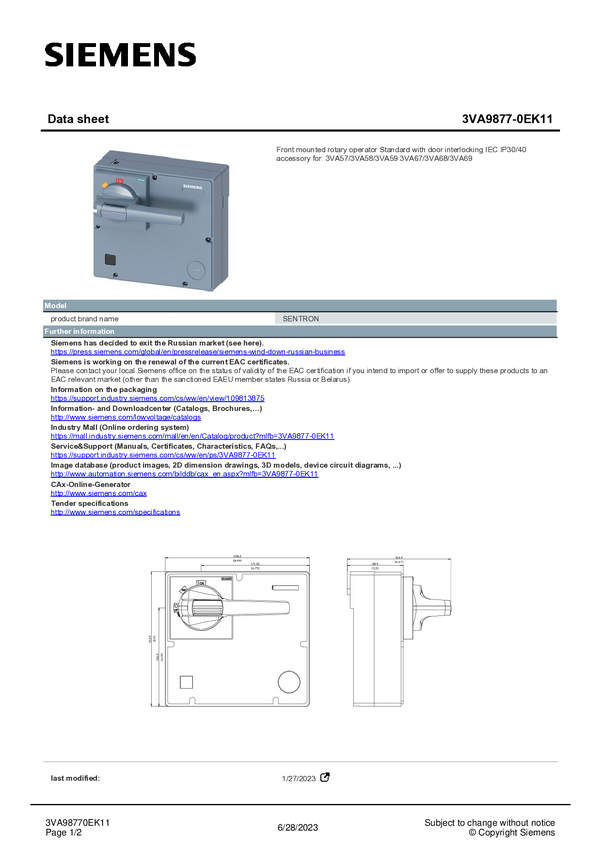 Przedni napęd rotacyjny Siemens 3VA9877-0EK11 1 szt.