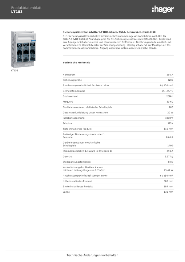 Hager LT153 Rozłącznik bezpiecznikowy Rozmiar bezpiecznika = 1 250 A 1 szt.
