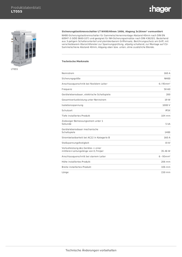 Hager LT055 Rozłącznik bezpiecznikowy Rozmiar bezpiecznika = 00 160 A 1 szt.