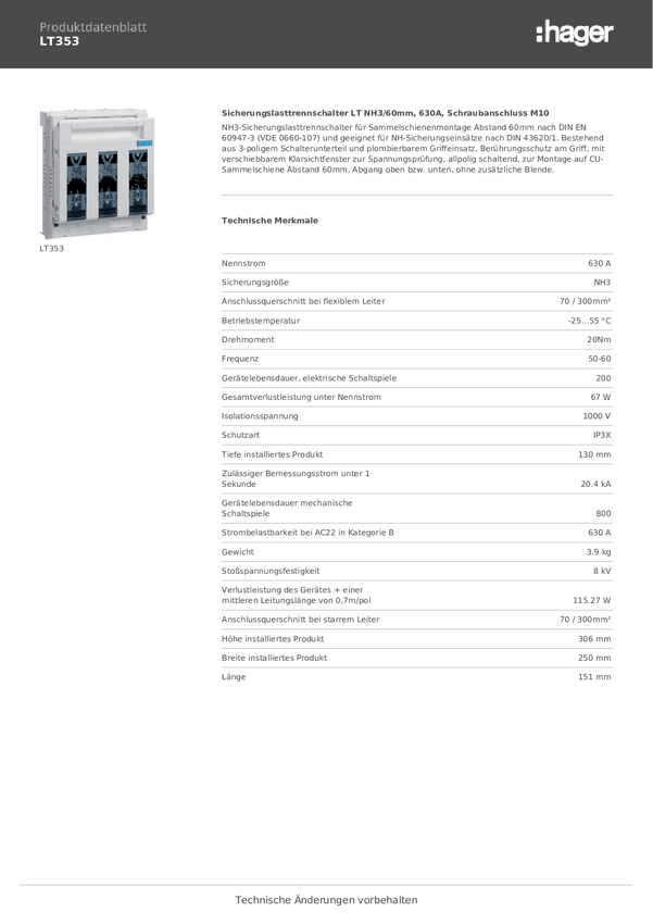 Hager LT353 Rozłącznik bezpiecznikowy Rozmiar bezpiecznika = 3 630 A 1 szt.