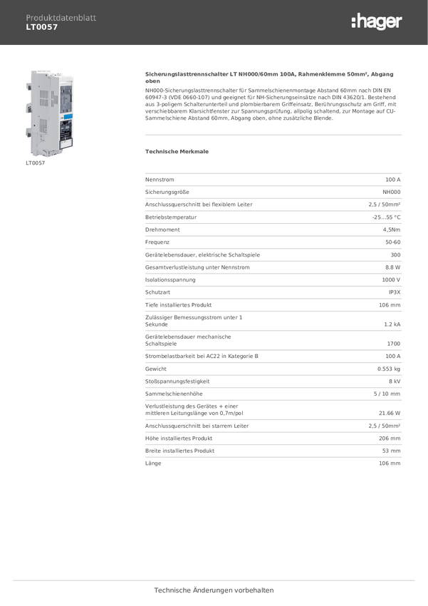 Hager LT0057 Rozłącznik bezpiecznikowy Rozmiar bezpiecznika = 000 100 A 1 szt.