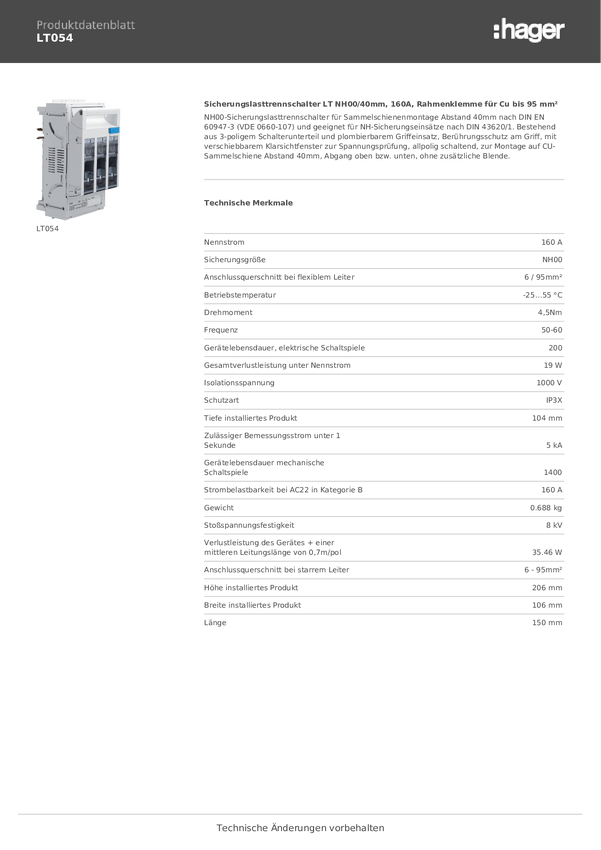 Hager LT054 Rozłącznik bezpiecznikowy Rozmiar bezpiecznika = 00 160 A 1 szt.