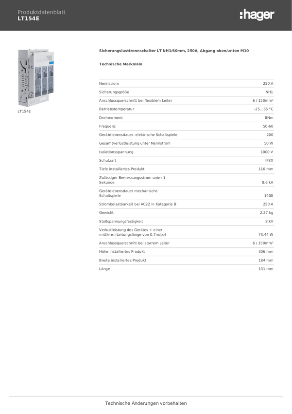 Hager LT154E Rozłącznik bezpiecznikowy Rozmiar bezpiecznika = 1 250 A 1 szt.