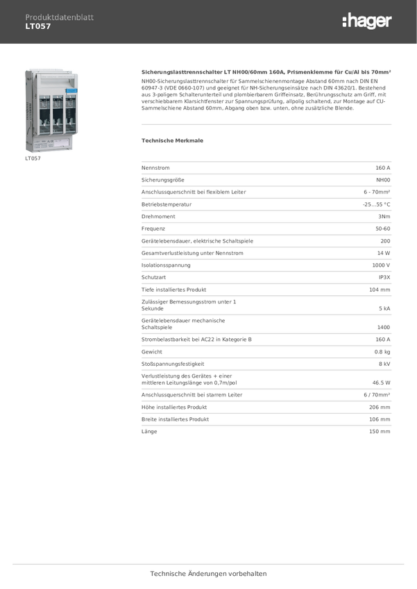 Hager LT057 Rozłącznik bezpiecznikowy Rozmiar bezpiecznika = 00 160 A 1 szt.
