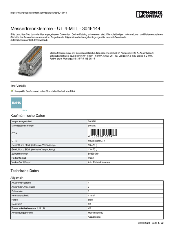 Złącze rozdzielające Phoenix Contact 3046144 śrubowe 50 szt.