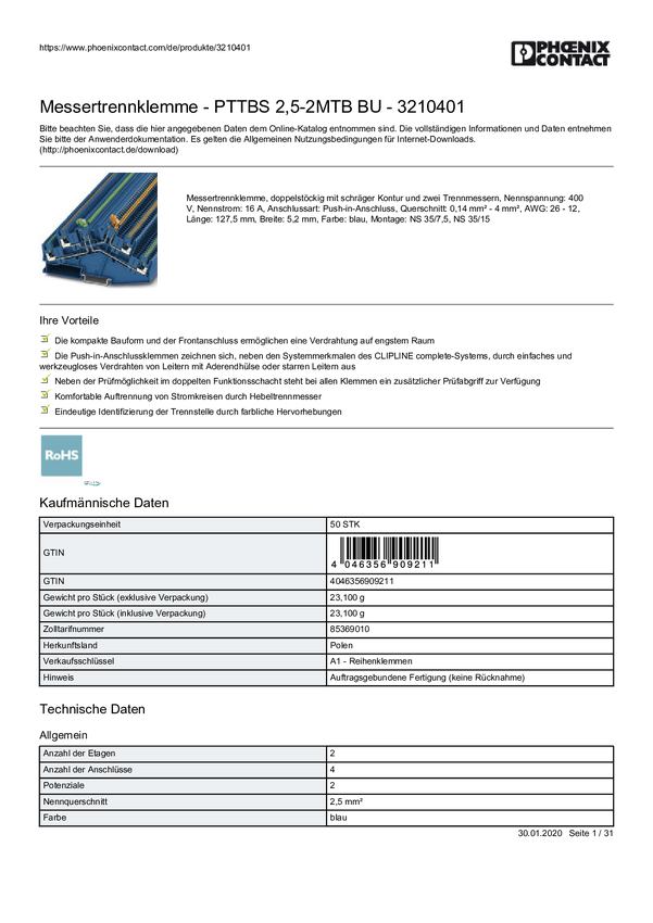 Złącze rozdzielające Phoenix Contact 3210401 zacisk push-in 50 szt.