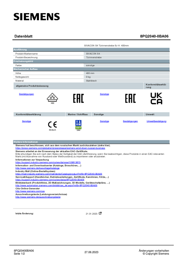 Rozpórka wewnętrzna drzwi Siemens 8PQ2040-0BA06 1 szt.