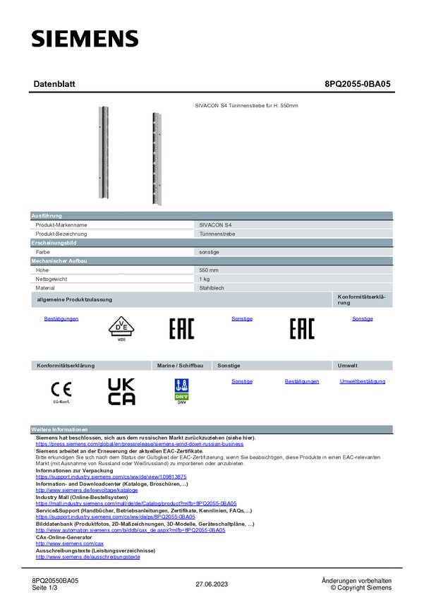 Rozpórka wewnętrzna drzwi Siemens 8PQ2055-0BA05 1 szt.