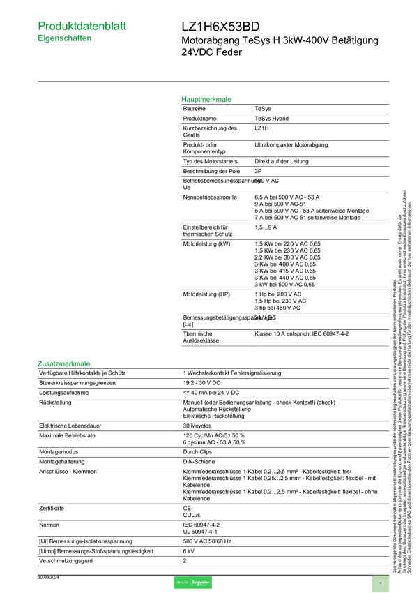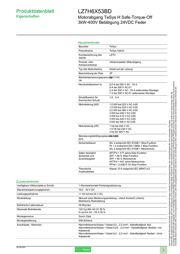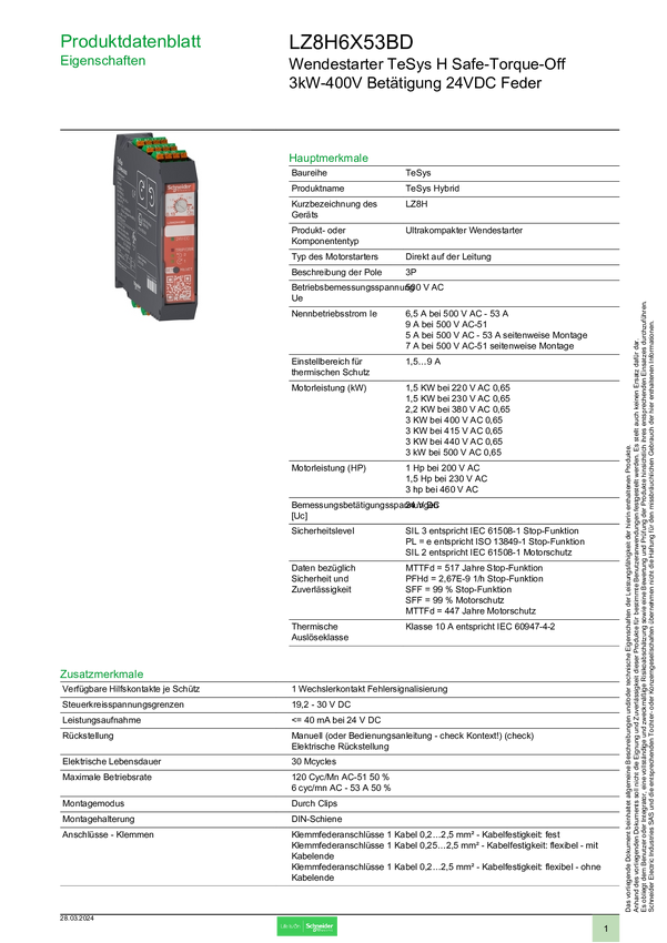 Schneider Electric LZ7H6X53BD LZ7H6X53BD Rozrusznik silnika Moc silnika przy 400 V 3 kW Moc silnika przy 230 V 1.5 kW N