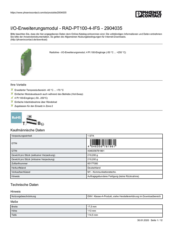 Phoenix Contact RAD-PT100-4-IFS 2904035 Moduł rozszerzający I/O