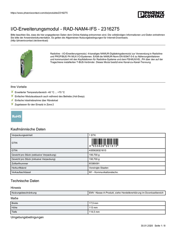 Moduł rozszerzający I/O Phoenix Contact RAD-NAM4-IFS 2316275, 1 szt.