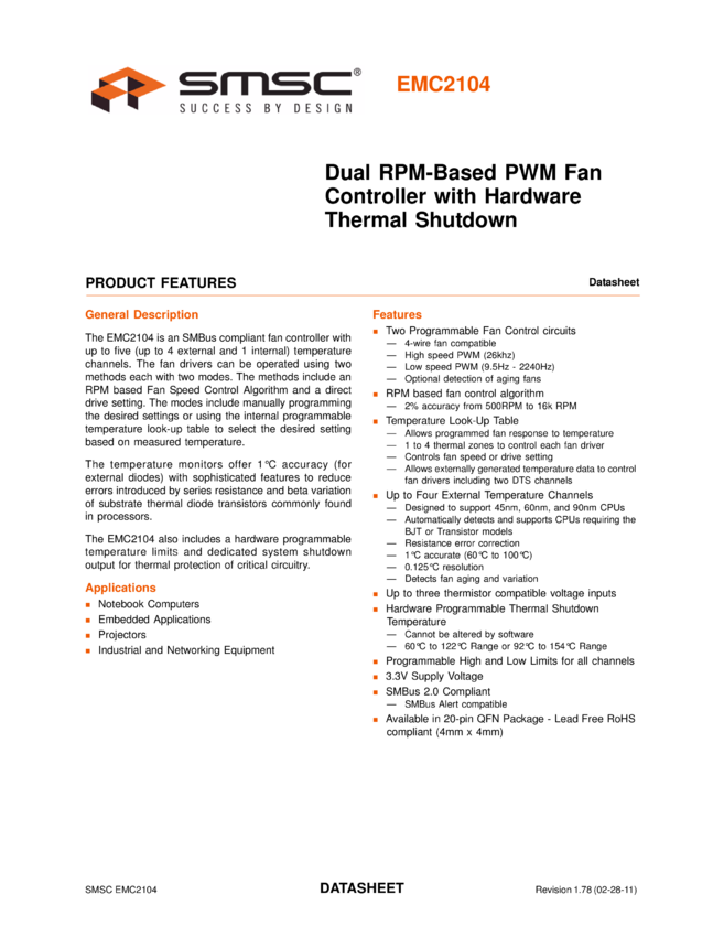 EMC2104 Dual RPM-Based PWM Fan Controller with Hardware Thermal Shutdown Data S (02/28/2011)