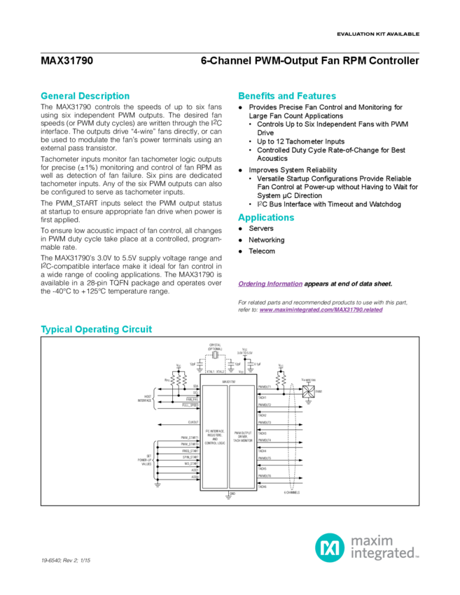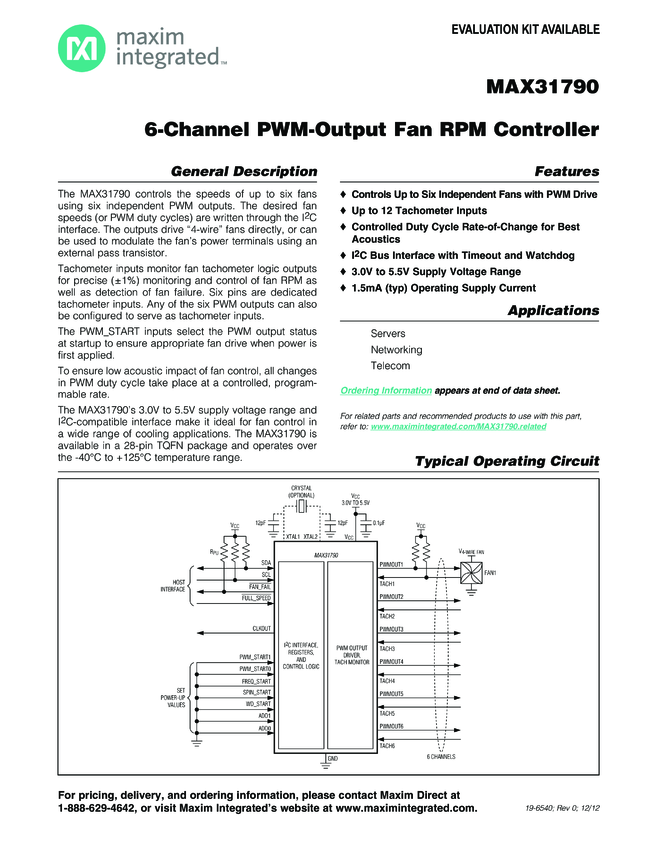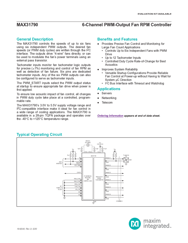 MAX31790 6-Channel PWM-Output Fan RPM Controller