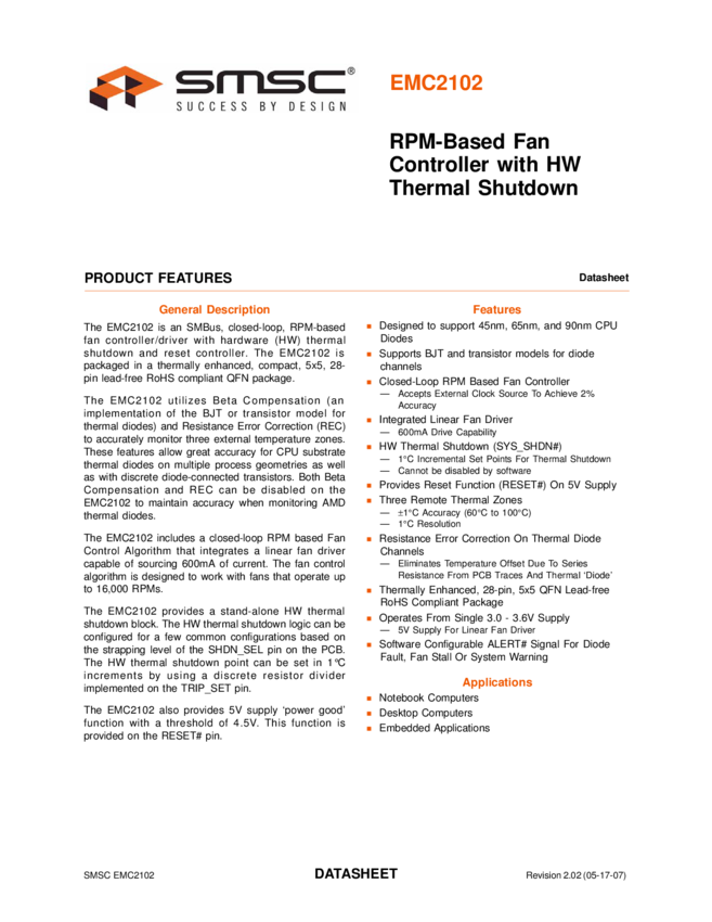 EMC2102 RPM-Based Fan Controller with HW Thermal Shutdown Data Sheet (05/17/2007)