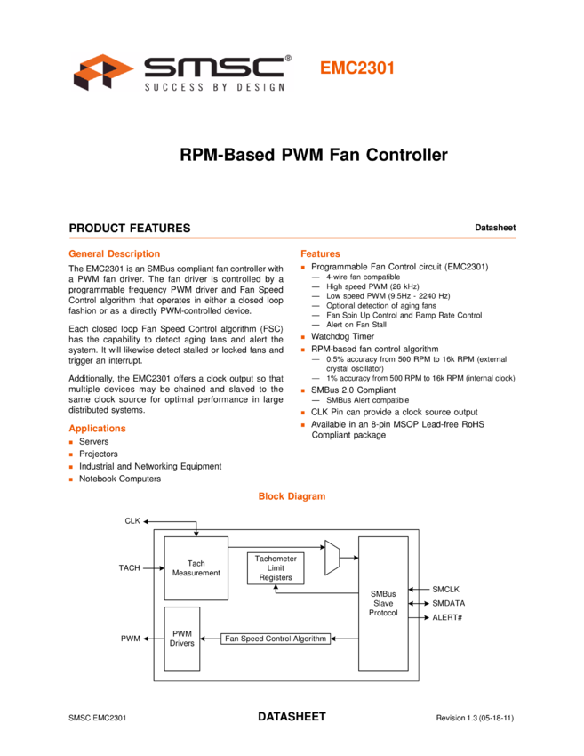 EMC2301 RPM-Based PWM Fan Controller Data Sheet (05/18/2011)