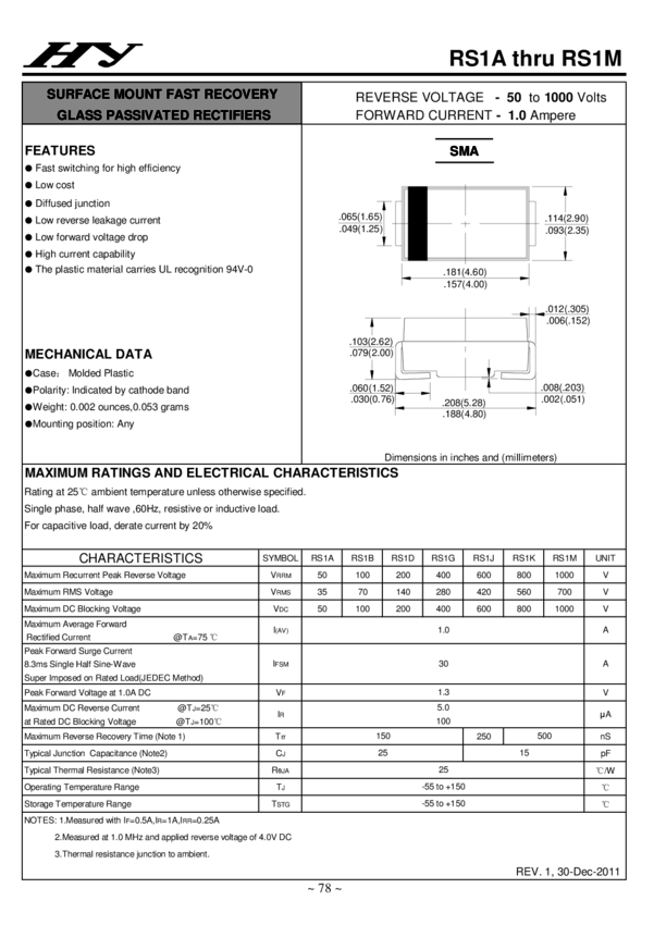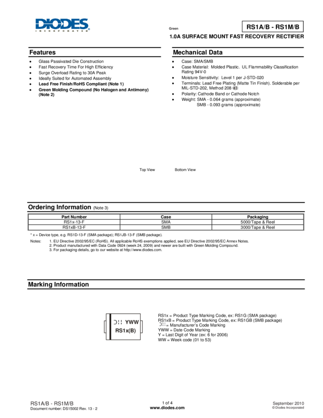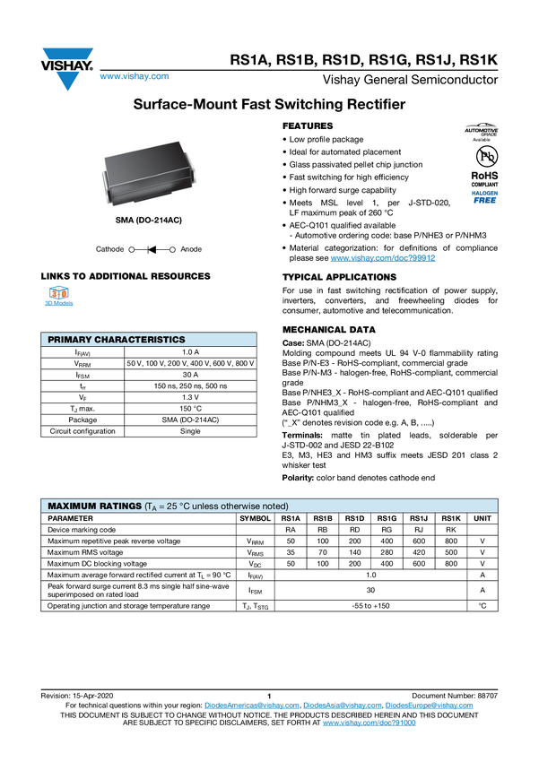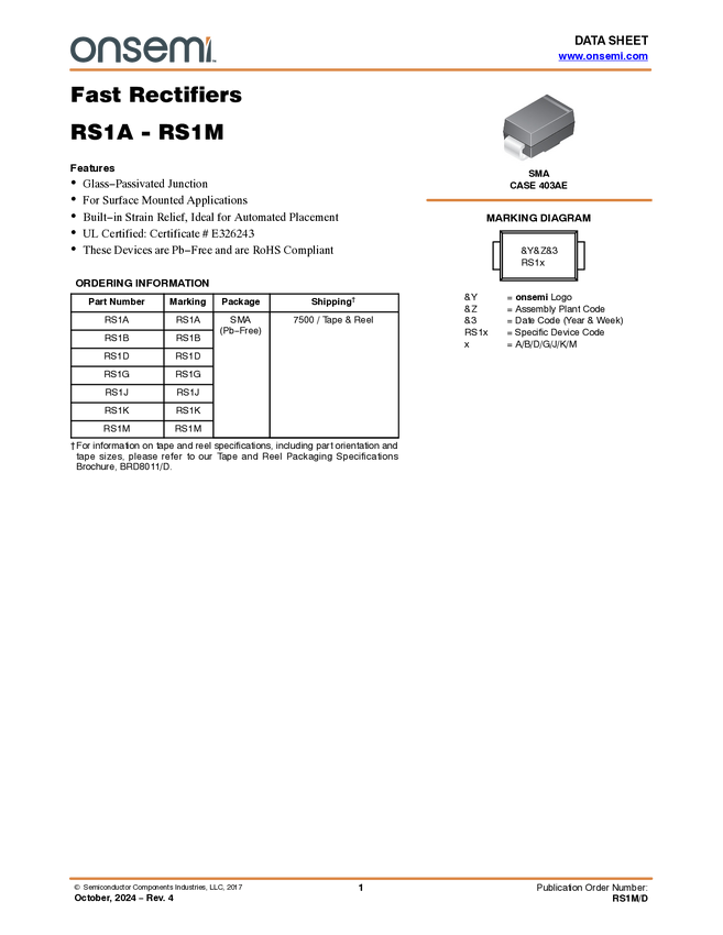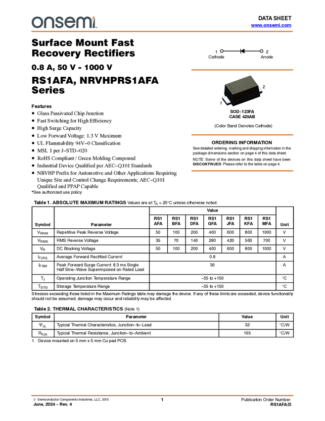 0.8 A, 1000 V Surface Mount Fast Recovery