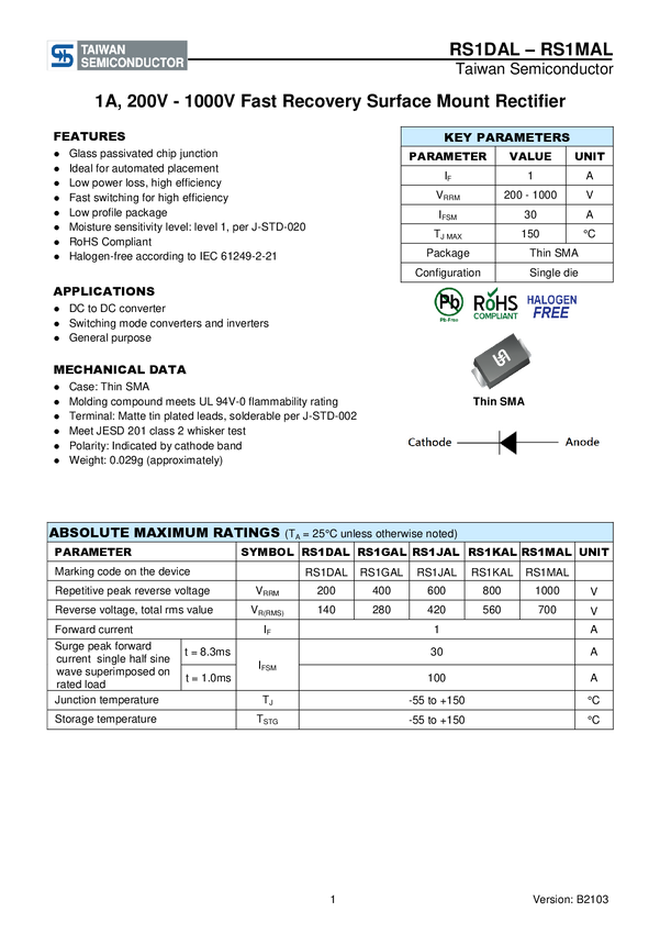 Taiwan Semiconductor Dioda prostownicza 1 mA RS1JAL Thin-SMA Pojedynczy taśma