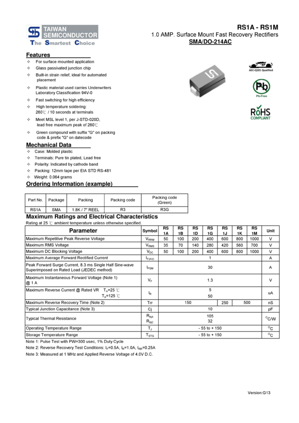 Taiwan Semiconductor Dioda prostownicza 800 mA RS1ML SubSMA Pojedynczy taśma