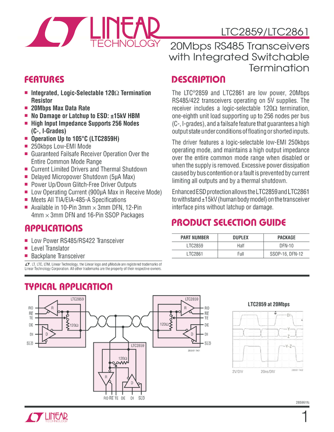 20Mbps RS485 Transceiver with Integrated Switchable Termination