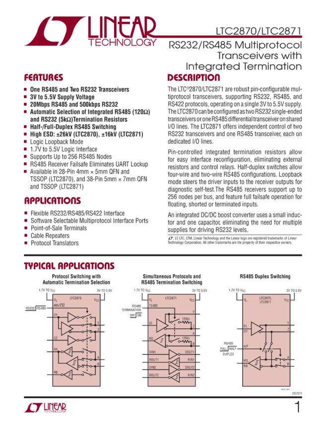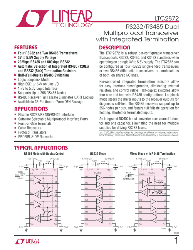 RS232/RS485 Multiprotocol Transceivers with Integrated Termination