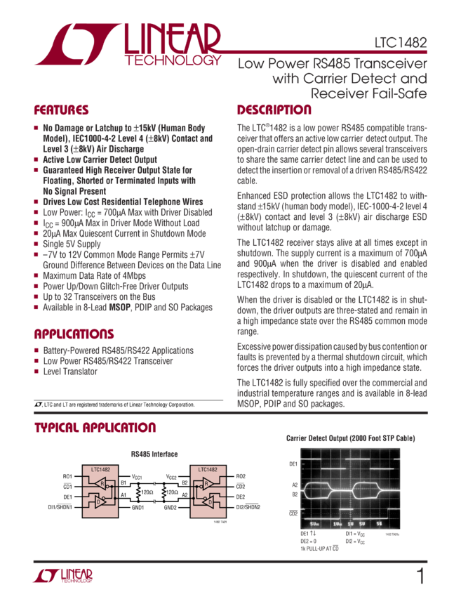 Low Power RS485 Transceiver with Carrier Detect and Receiver Fail-Safe
