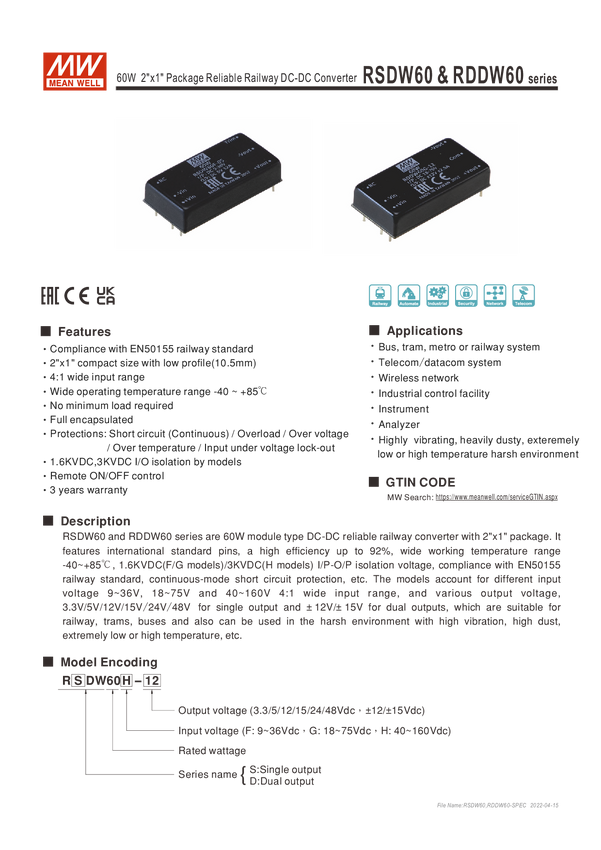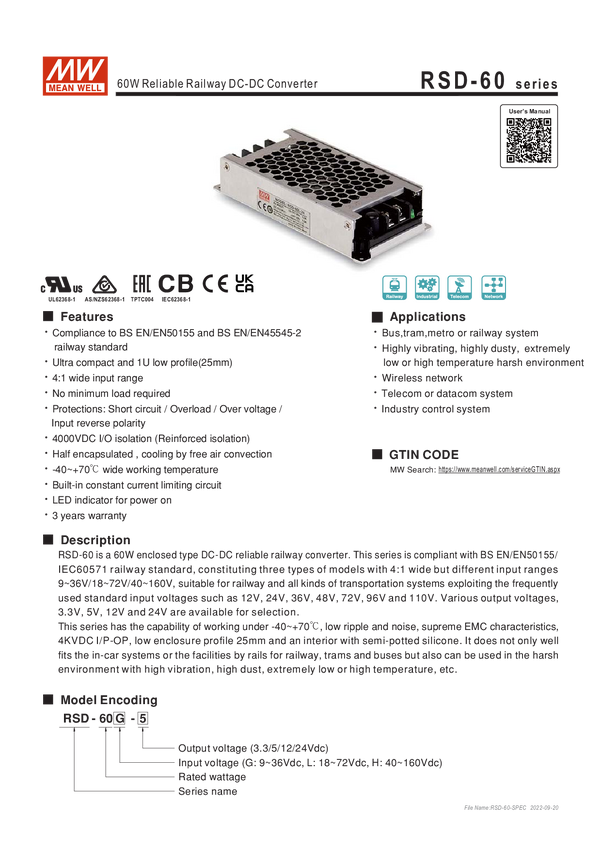 Przetwornica DC/DC 40-160V:12V 5A 60W MW Mean Well RSD-60H-12 1 szt.