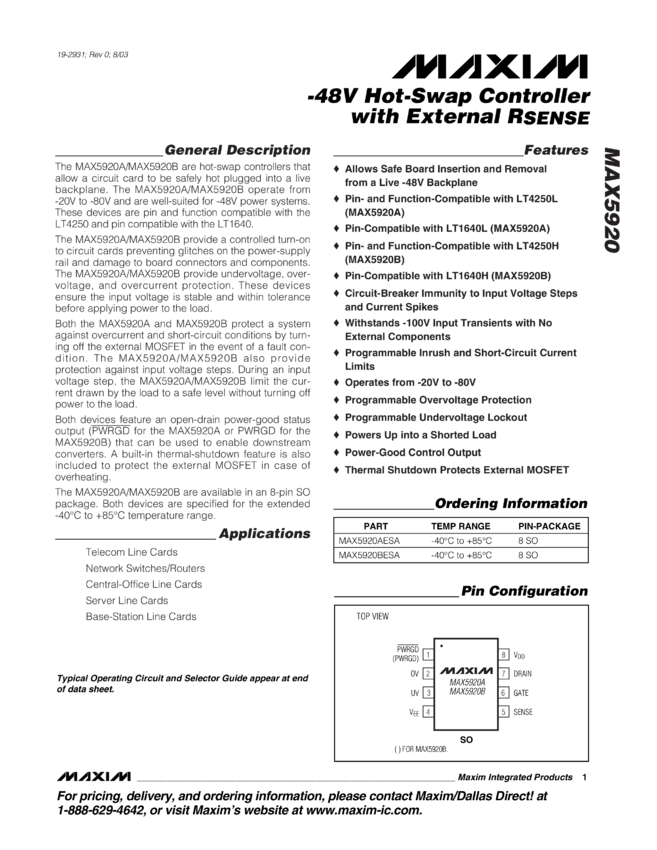 MAX5921, MAX5939 -48V Hot-Swap Controllers with External RSENSE and High Gate Pulldown Current