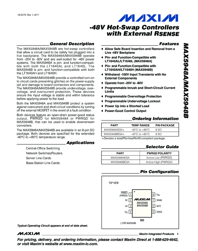 MAX5948A, MAX5948B -48V Hot-Swap Controllers with External RSENSE