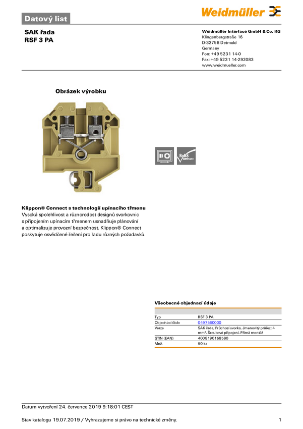 Złączka szeregowa RSF 3 PA 0497560000 beżowy, żółty Weidmüller 50 szt.