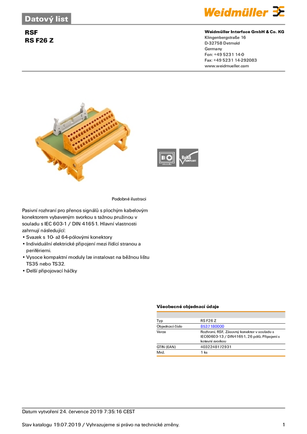 Interfejs, RSF, Złącza wtykowe wg IEC 603-1/ DIN 41651, 26 biegunów, złącze sprężynowe RS F26 Z Weidmüller Zawartość: 1
