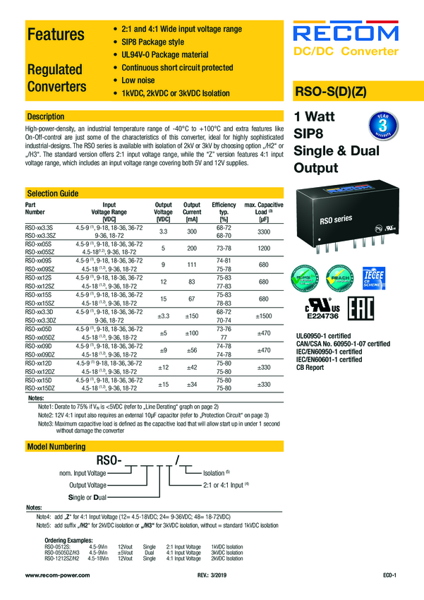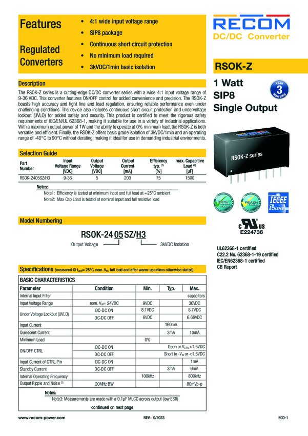 RECOM RSOK-2405SZ/H3 Przetwornica DC/DC 5 V 200 A 1 W Ilość wyjść: 1 x Content 1 szt.