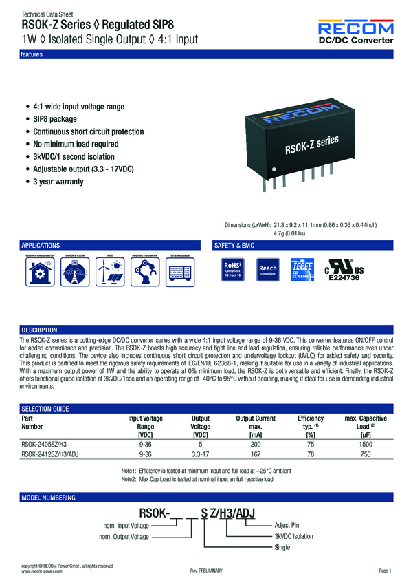 RECOM RSOK-2412SZ/H3/ADJ Przetwornica DC/DC, do PCB 24 V 12 V 0.167 A 1 W Ilość wyjść: 1 x Content 1 szt.