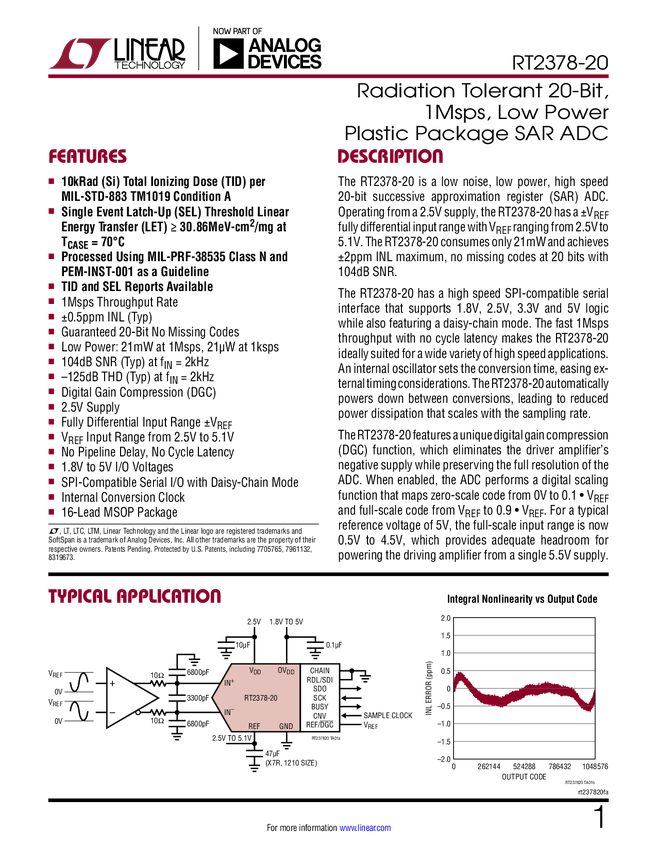 Radiation Tolerant 20-Bit, 1Msps, Low Power Plastic Package SAR ADC