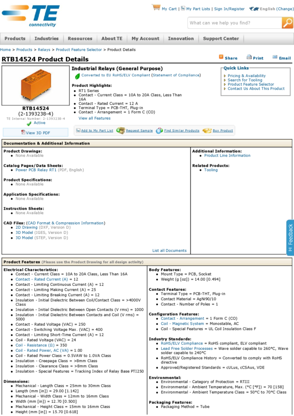 Electromechanical Relay SPDT 12A 24VAC 350Ohm Through Hole