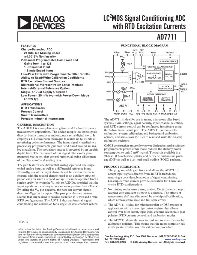 CMOS, Low Power 24-Bit Sigma-Delta, Signal Conditioning ADC with Matched RTD Current Sources