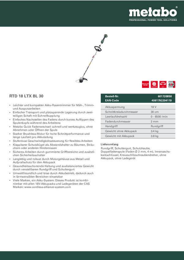 Metabo RTD 18 LTX BL 30 akumulatorowy Podkaszarka bez akumulatora, Uchwyt D 18 V Maksymalna szerokość cięcia: 300 mm
